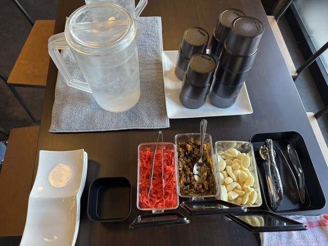 セルフでお冷と紅ショウガや高菜を小皿に取ります。