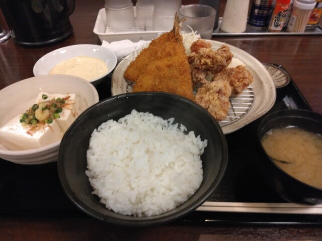 あじフライ定食はあじフライ2枚に加え唐揚げ4個付!あじフライはふっくらと揚がっており下味しっかり系の唐揚げも美味しかったーなんにせよ、このご時世にこれだけの物が1,000円以下でいただけるのはびっくりしました。お店の雰囲気も良くて隣の方が注文されていた野菜炒め?がすごく美味しそうで、また伺います!