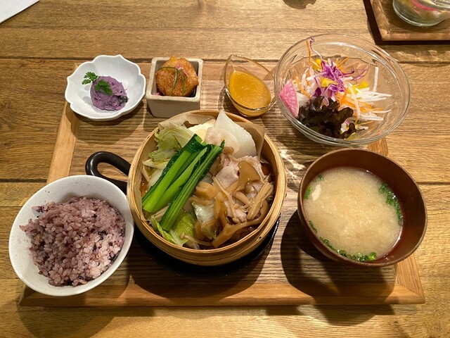 堺東駅のロータリーからすぐのGRANさん。久しぶりにお邪魔しました。週替わりのバランスプレート「茶美豚と冬野菜のせいろ蒸し きのこあんかけ」をいただきました。玄米か雑穀米かを選択できます。ここの甘みのあるお味噌がとても好みです。