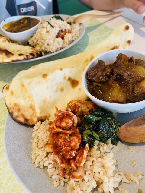 マトンカレーとトマトの2種類食べました。すっごく美味しかったです!程よいスパイスと玄米とちょうど良いサイズのナンで大満足でした。付け合わせのほうれん草のソテー?とひよこ豆のトマト煮もご飯と合って美味しかったです。カフェイン取れないのでコーヒー頼めませんでしたが同行者が飲んでいたアイスコーヒーの香りが絶品でした。