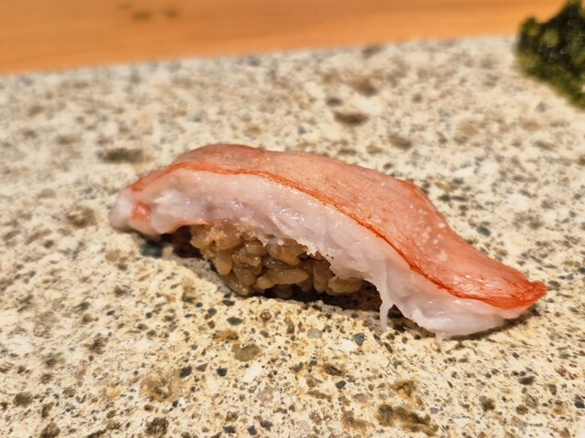 塩とカボスでいただきます。鯛の旨味と昆布の風味のバランスが素晴らしい。程好い歯応えと食感で美味しくいただきました。