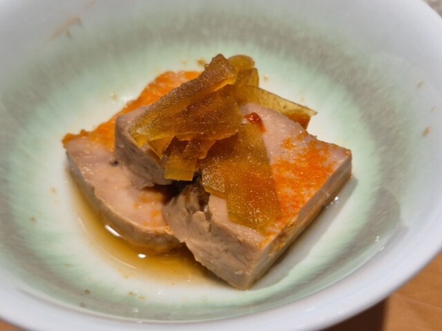 あん肝を煮付けでいただくのは珍しい。ちゃんとあん肝の味わいを損ねず、良い具合に仕上がっています。添えてある奈良漬けが素敵なアクセント。