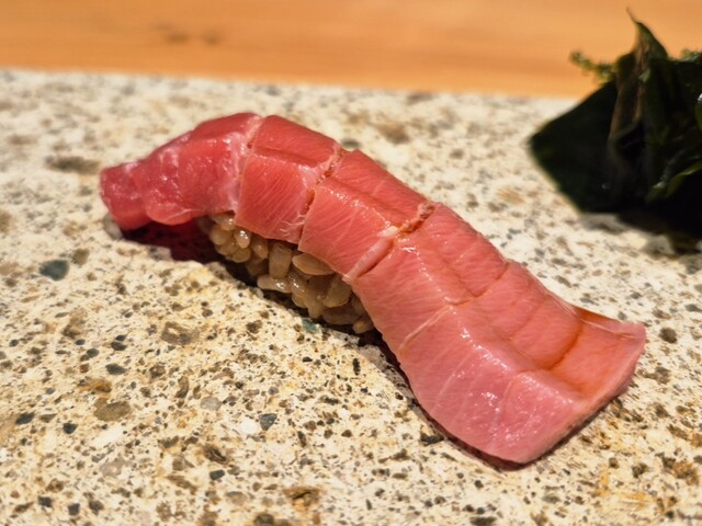 オープニングの1品。鮪の旨味と脂の甘味、海苔の風味のハーモニーが最高です。