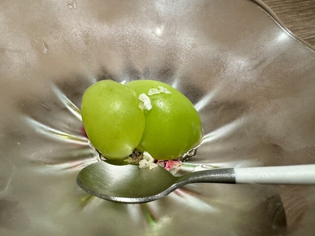 シャインマスカットにエルダーフラワーのジュレ、上にパチパチキャンディがかかっています。