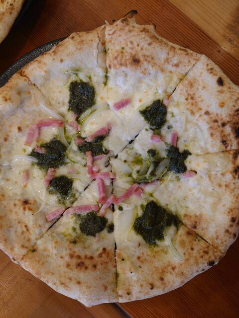 生地が薄いけれど、モチモチとしていて味のある大きなピッツア。