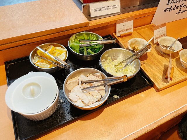 このお店の数ある魅力の中でも、外せないのが鶏白湯ラーメン。 お寿司コーナーの横にあるライブキッチンで一杯ずつ仕上げてくれるスタイルで、好きなトッピングを選びながら自分好みに仕上げられます。