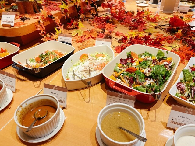 ビュッフェは海鮮や旬野菜を中心に、焼き鳥・ステーキ・アヒージョ・ハンバーグなど多彩な料理が並びます。