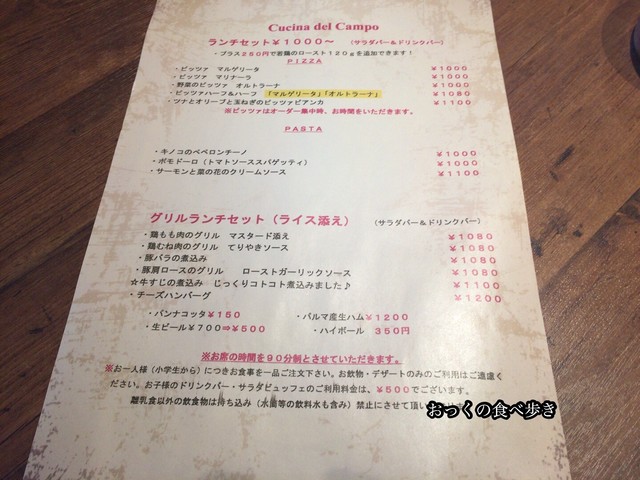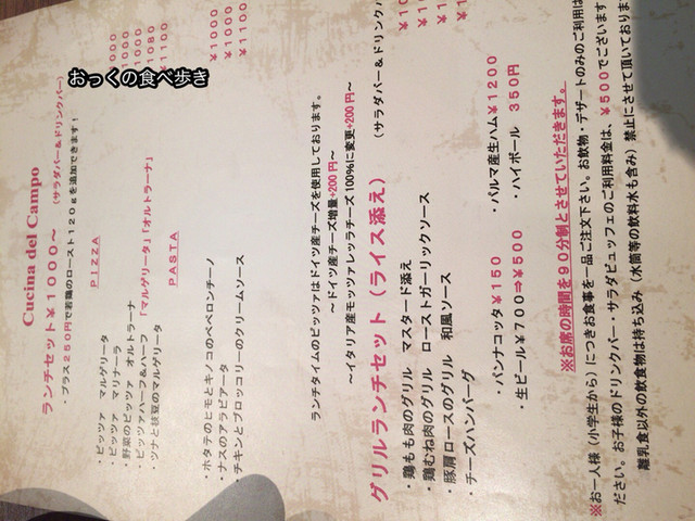 平日は、ランチメニュー(1200円~)にサラダバーとドリンクバー(赤白ワイン付き)が付き、土日祝のランチは、少し金額が高くなるものの、ドリンクバーに赤白ワインの他にスパークリングワインが付きます。昼から飲みたい人にはかなりお得なお店です。