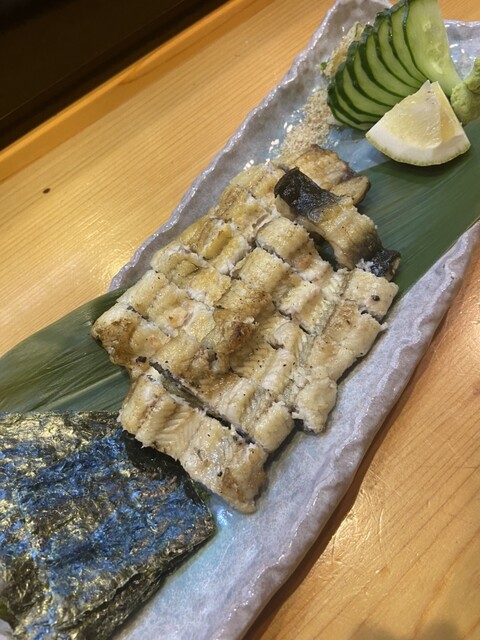 鰻の白焼はその場で鰻を捌いてくれ、目の前で串に刺したまだ動いてる状態の天然鰻を見せてくれて動画に撮りました笑