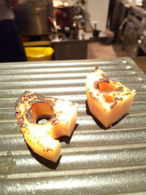 ムネ昆布締め白レバー葱巻き、一味をかけて