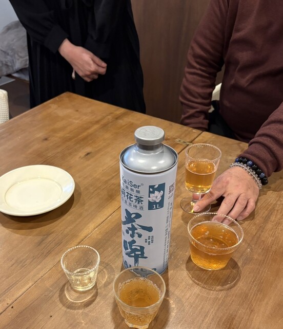 参考写真、アジトでおしゃべり、中国のビール飲んで