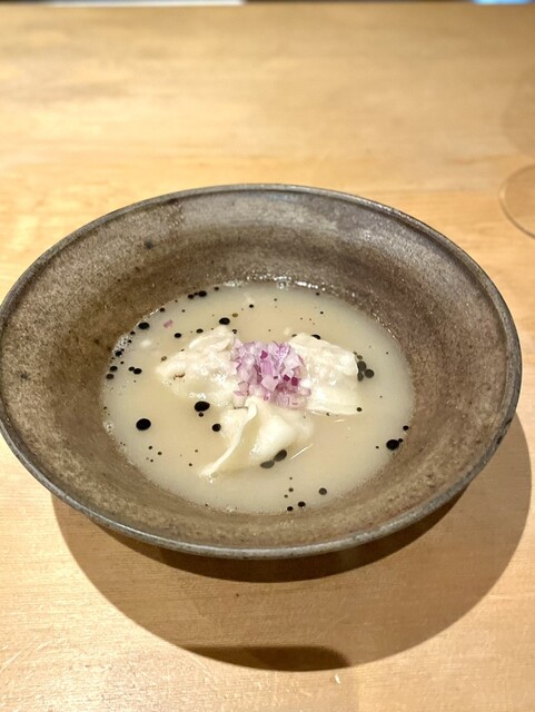 当店おすすめの逸品。アツアツのスープは鶏白湯仕立てで、焦がしラードの風味は濃密。水餃子の肉は千葉県のブランド豚「林SPF」を一頭買いしているとの事。口に入れると豚肉の甘みがふわっと広がりつつアクセントの生姜が効いてグッド。〆に麺を入れたい。