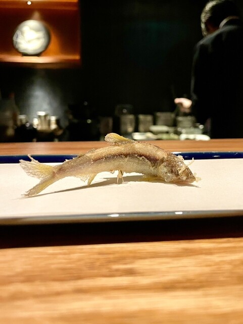 目のまえで生きている稚鮎のプレゼンテーション。これはテンション上がります!先ほどまで泳いでいた新鮮な状態で、立体的な仕上がり!肝の苦味も含め命に感謝!このタイミングで日本酒は分かっているな~!