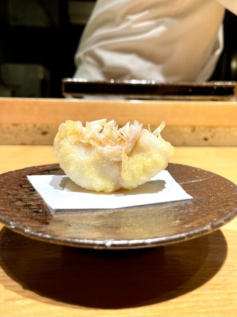 皮目をカリッと立たせた松笠揚げは、揚げたての香ばしさと身のふっくら感のコントラストが良いですねえ。特に身のふっくら柔らかな食感が際立ちます。