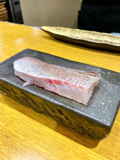 表面は薄く、皮面には塩が振ってあります。最後は目の前で炭を当てて仕上げます。炙って香ばしさを出し、しっとりとした身に炭の香りがうっすらと残る。こちらに柑橘系のレモンを添えるような風味で選ばれた白ワイン。めちゃんこ合う組み合わせ!さすがソムリエ・・!