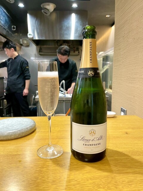 シニアソムリエが常駐しており、料理に合わせたペアリングも可能。最初の一杯はおすすめのシャンパーニュから。スタッフさんのドリンや料理の説明や接客も丁寧。
