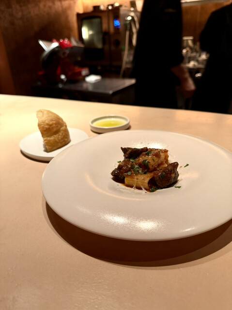 脂の乗ったメカジキを、ケッパーとオリーブの酸味を効かせたソースが鮮やかに彩ります。 とうもろこしの粉を用いたポレンタの素朴な甘みが、メカジキの旨みをしっかりと受け止める構成。 香りが非常に高く、一口ごとに異なる香味が押し寄せます。魚介の質と繊細さの観点で、一番記憶に残った一皿かもしれません。