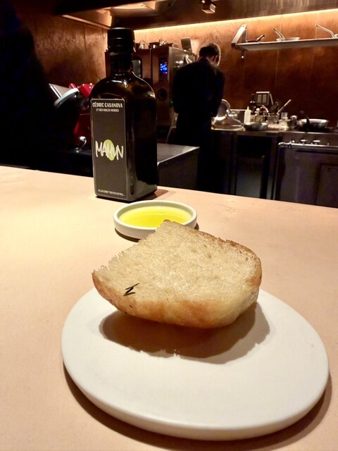 正月の炭をイメージしたとのこと、季節感を感じさせます。黒を纏ったシックな見た目からは想像できないほど、中は熱々でクリーミーな蟹の旨みが凝縮。オリーブオイルと塩のみのシンプルな味付けが、蟹本来の甘みを鮮やかに引き立てます。後述しますが、このオリーブがとにかくうまい・・。
