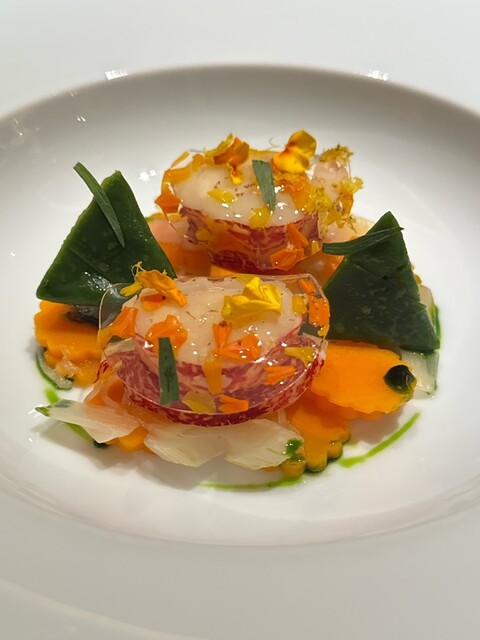 萩産甘鯛のうろこ焼き 紅心大根に包んだヴェルヴェンヌ風味のキャロットのムースリーヌ キャラメリゼした魚のジュとシトロンコンフィ