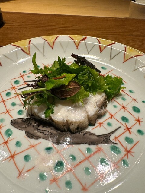 米藁で燻した勘八(アカハナ) 安岡葱 紫蘇花