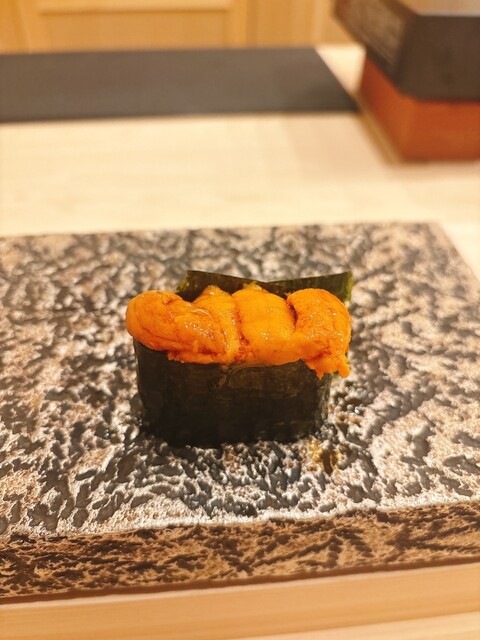 漬けマグロ、中トロの炭炙りとマグロの表現も分かりやすく、ボタン海老、雲丹と続いたあとに供される和牛と雲丹も過剰にならない抑えたまとめ方。