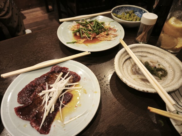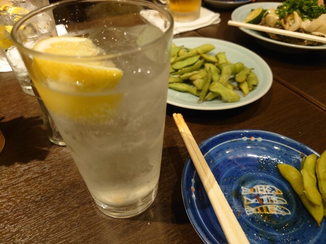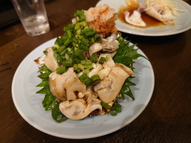 岩牡蠣やブリの照り焼きなどどんどん運ばれてきます。レモンサワーに変えて季節柄枝豆もあります。