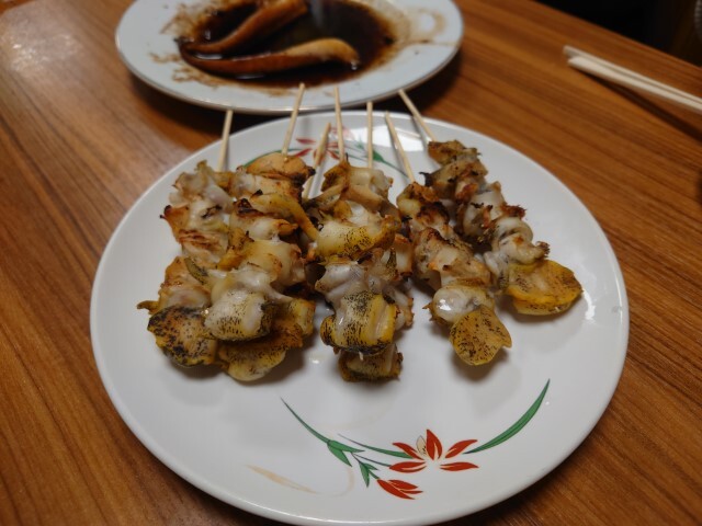 イカゲソの肝バター炒めにつぶ貝の串焼き、、。ごれがまたどちらも最高です!ビールから黄色におかわりです。