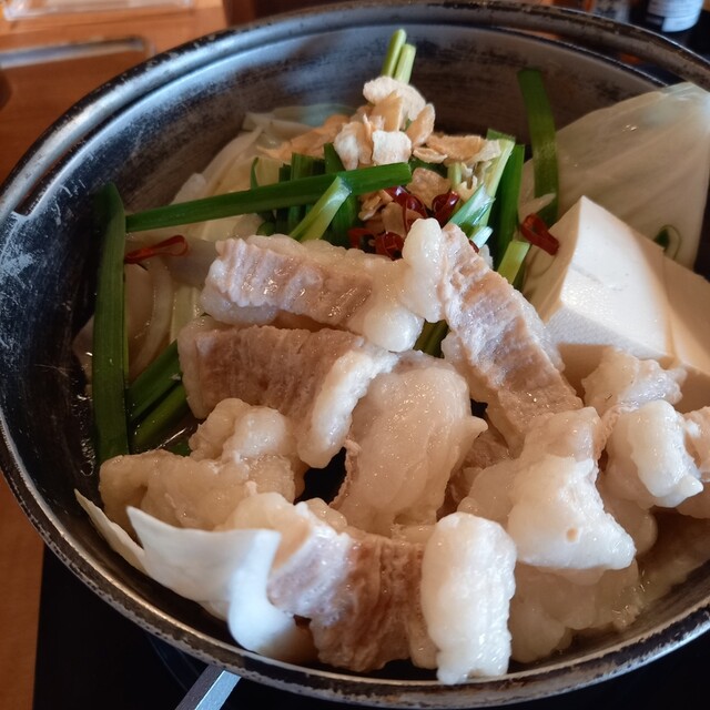 もつ鍋は、牛もつで、具材はキャベツ、ニラ、豆腐、唐辛子、ガーリックフライ、ゴボウ、タマネギかな