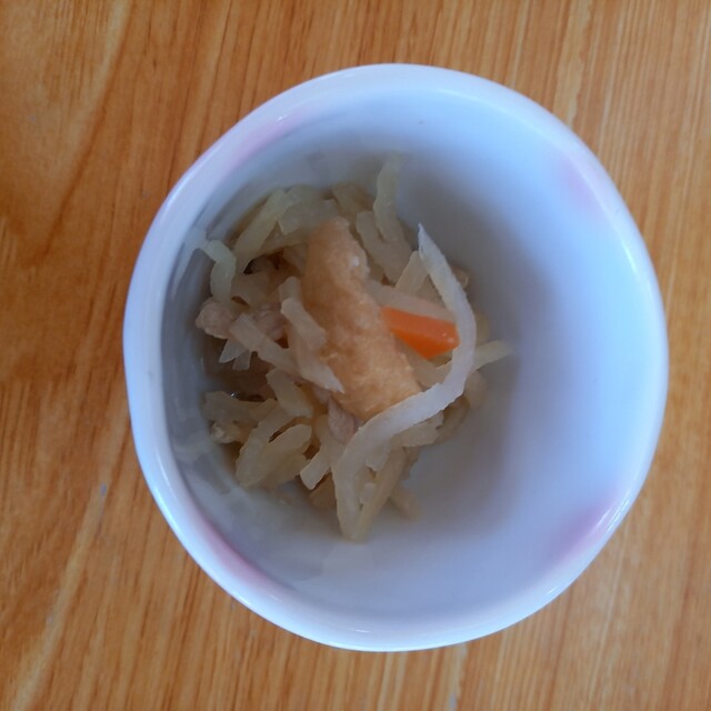 青菜、大根、おあげさん、鶏肉の炒め煮ですね