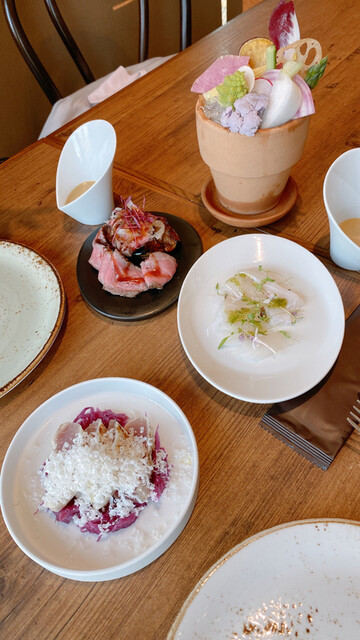 とにかくこだわりの食材を使った、たくさんの品数が登場します。1日の摂取食材の必要な種類の量以上の食材を、こちらのお店一件で、それ以上の種類を食す事ができるほど沢山の食材を惜しみなく、それも少しづつ丁寧に料理して出してくれます。もっと食べられる時は後からもう一度お願いするとお気に入りのものを改めて出してくださいます。