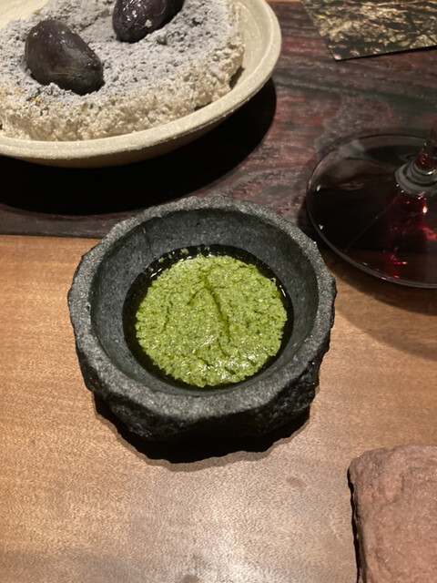 →柔らかく調理したタコ、イカ墨のネット、スピルリナ、青いスピルリナの泡。ケミカルな色合いですが天然の色素。見た目に反して味わいは分かりやすく香ばしい。美味い。意味わからん。