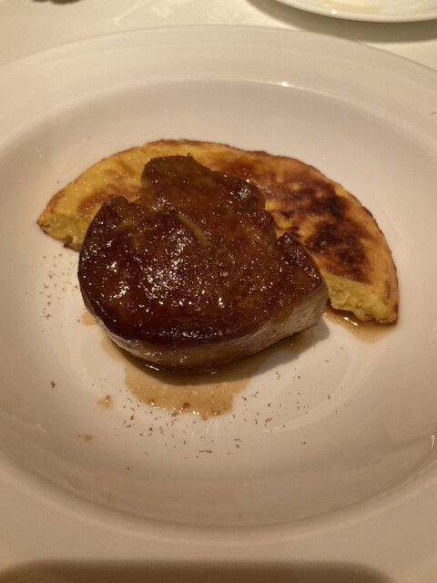 次はフォアグラのポワレ。付け合わせはトウモロコシのガレット。この付け合わせが絶品。とうもろこしの甘さとフォアグラの香ばしさと甘みが合わさってノックアウト。悶絶級の味。