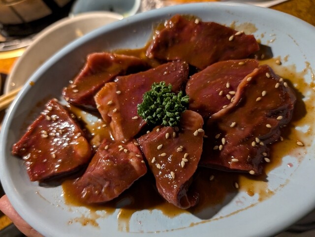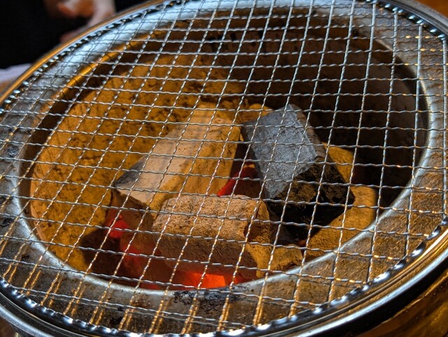 いつも通りタン塩からスタート。お店によっては、こんなに薄くよく切りましたね、という薄さで提供するお店もありますが、七輪さんのタンは硬すぎす、柔らかすぎず、ちょうど良い厚さ。塩コショウ振っただけなので、肉の味をしっかり味わえます。片面焼いた時点で、脂も下に落ちるのが見えるぐらい上等です。