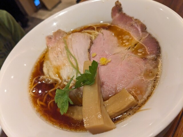 チャーシューで麺を包んで貝出汁に付けて食すと更にボリューム感たっぷりで、ハムスターのように口が膨れて更に幸せたっぷりになります。