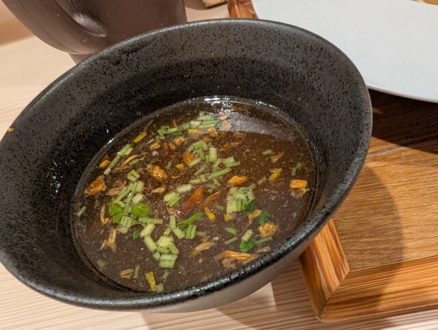 次は貝出汁を付けて麺をしょくす食すと、貝からでる出るコハク酸の旨味が口いっぱいに広がり、口の中が幸せいっぱいです。