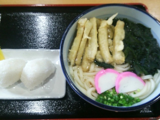 なので、温かいごぼう天うどんにワカメトッピング、そしておにぎりを注文。