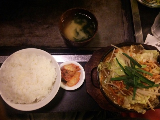 内容は、ホルモン鉄板焼、ご飯、味噌汁、キムチ