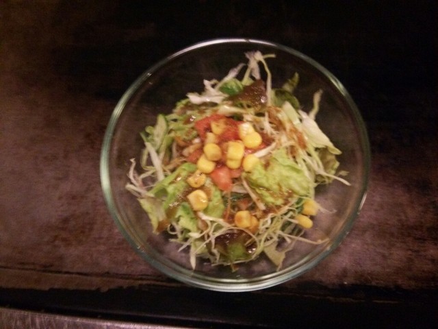 野菜サラダは上にはコーンが散りばめられ、その下にカットトマト、キャベツ、レタス。野菜の量はそれほどありませんが、鮮度には拘っているように思います。