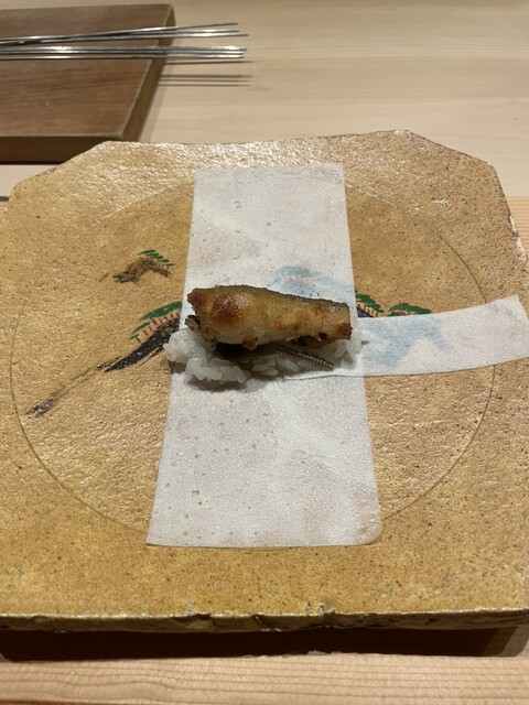稚鮎の絹巻き寿司、一度揚げてから炭焼き◎