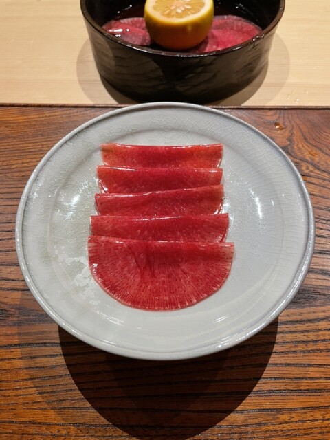 三輪漬け、橙、紅芯大根◎橙の爽やかの果汁感からパリパリと心地よい食感、後味に唐辛子の辛さが抜ける感じ