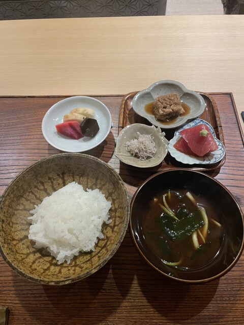 マグロ、スッポン煮凝り、山椒ジャコ、香物