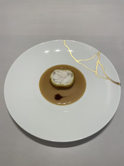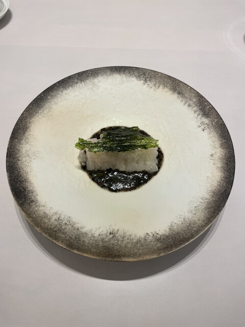 豊浜の鱧、焼き霜、海苔のチュール、ナッツで風味付けしたイカ、海苔のアーリオオーリオ◎