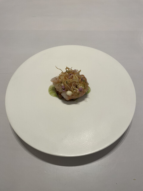 甘海老、ラタトゥイユ、長芋すりおろしガレット、西洋ネギオイル海老出汁、ウイキョウピューレ◎