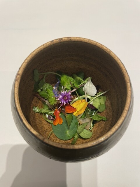 蛍鳥賊黄ニラとソテー、神戸ビーフの生ハム、フカヒレ春巻き?しいたけパウダー、うるいパクチー等◎