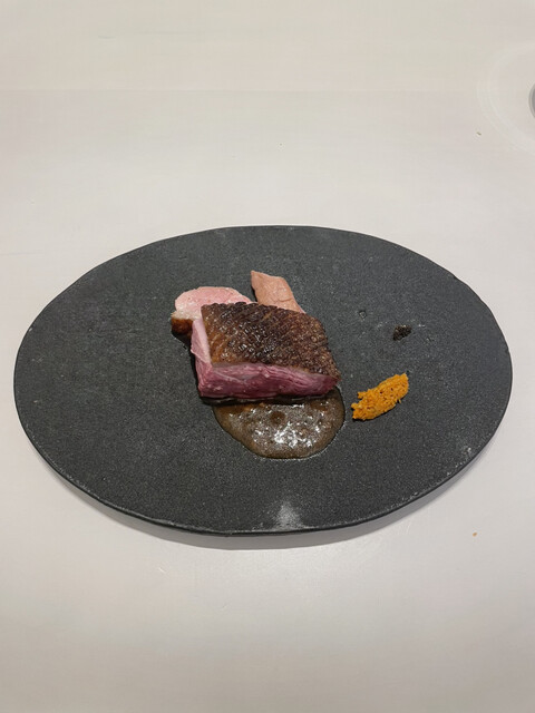 雲丹、キャビアと共に海苔のチップスに、クルトン百合根マイクロアマランサス◎