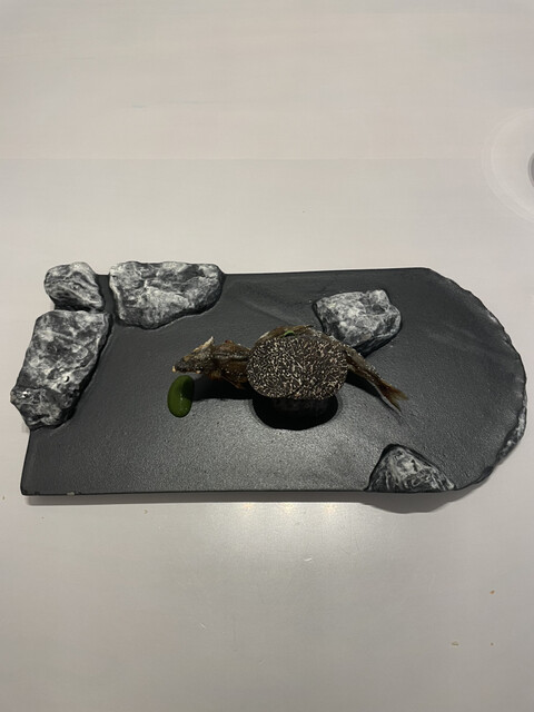 鮎の炭火焼、モッツァレラチーズと肝のソース、トリュフ、蓼と米のソース◎
