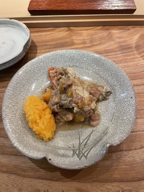 蟹のブランデー漬け、酒盗、残ったソースはシャリと合わせて◎