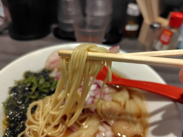 初めてなので一押しの淡麗ラーメンにワンタンを付けて注文。注文から数分ですぐに食べられる。見た目もキレイなスープ。かなりあっさりめ。麺は細くスープとよく絡む。