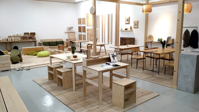 ※こちらは、ナカバヤシ株式会社の工場であった建物をリユースして作られています。同社は岡山県西粟倉村森林を守る間伐サポーター企業としての活動をされているので、DIY用の木材や家具が展示されていました。