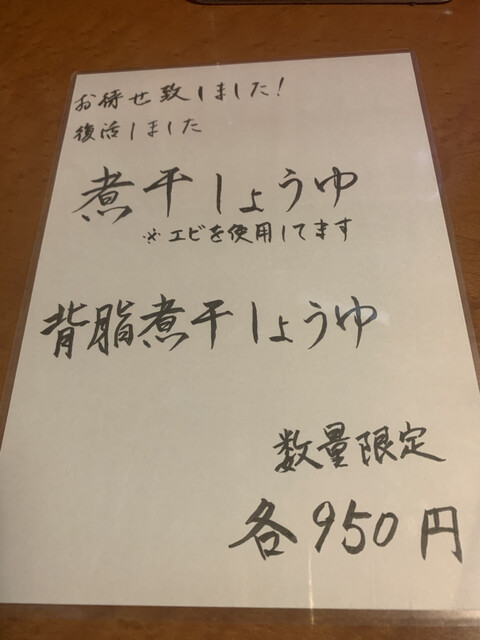 復活メニュー!背脂煮干し醤油ラーメン大盛り味玉トッピング